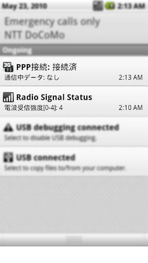 b-mobile SIMを使うと常に圏外表示になってしまうので、電波受信強度(4本のアンテナ表示)とデータ通信状況(PPP接続状況、パケット送信・受信表示)をステータスバーに表示するアプリを作成しました。