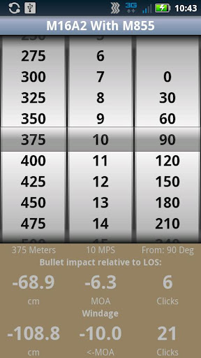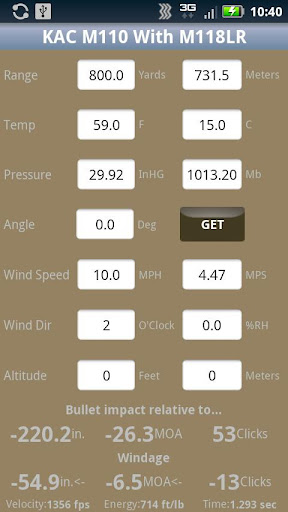 Knight's Armament BulletFlight is a military-grade ballistic computer that provides quick solutions in the field. BulletFlight does not output information in table format but rather dynamically gives you the solution you need now to make that shot. Current weather conditions including temperature, pressure, humidity, wind speed, and wind direction can be input, as well as angles to the target as measured by the built-in accelerometer. The app then provides highly detailed solutions out to 3000 meters. Your weapon profile includes your scope MOA/mRad per click, and hence when you provide a range to the target, the app will simply show how many clicks you need to change the scope by for that range and wind speed.