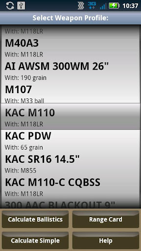 Several built-in profiles for the Army's M110 and M110C semi-automatic precision rifle, the Army's new XM2010 sniper rifle, the 14.5 inch SR16 rifle, The 50 BMG M107, .308 M40A3, .308 M24, and the 6.5mm KAC PDW allow you to get started quickly. You may alter these profiles, or add new ones.