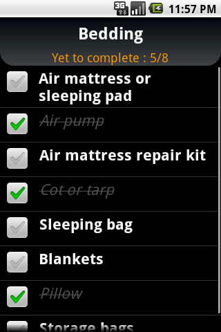Configurable camp checklist with everything needed for camp trips. Comes pre-populated with more than 225 camp items. If you are a camp person, this is all you need to ensure you don't forget anything. Check/uncheck and reuse everytime you go on camp trips. Save all the time typing the camp list. Easy and very intuitive thumb friendly check/uncheck options.