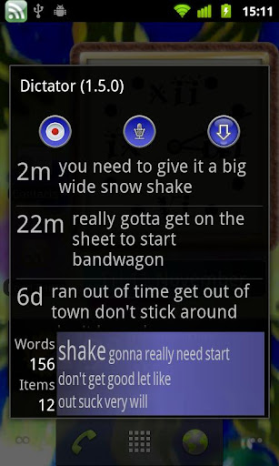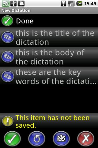 The Main Screen shows your Dictations and handy Tag Cloud shows what you've been talking about. Use the Volume Keys to start eyes-free recording and extend items.