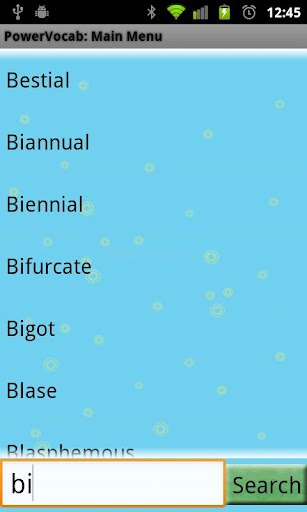 The key app features are Learn words, Challenge quiz, and Search words. The words contain detailed definitions, multiple example sentences, and phonetic pronunciation of words. Audible pronunciation is also available if your cellphone is running on Android 1.6 or above. In addition, a dictionary like list is available for searching word definitions and sample sentences.