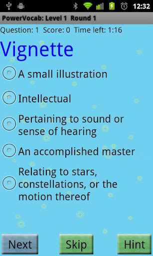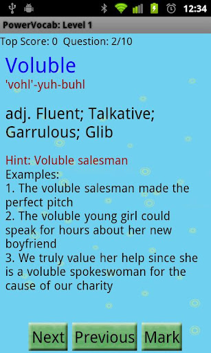 Play PowerVocab(TM) Ultra and build a cutting edge vocabulary! This application has no annoying ads! You will master challenging words using our smart software that uses adaptive learning techniques to build a lasting vocabulary. This app is specifically helpful for students of SAT, GRE, GMAT, and ASVAB, who are looking to substantially enhance their vocabulary into top tier. This app lets you build a lifelong critical skill without paying thousands of dollars.