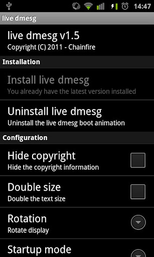 The paid version adds features to hide the copyright notice, enlarge the text size, and rotate the display. For the ultimate geekgasm, get the paid versions of both live dmesg and live logcat, and display both in split screen mode during boot. In that case you can also switch between the three modes during boot by tapping the screen.