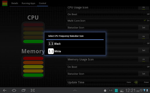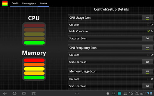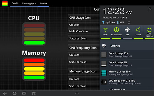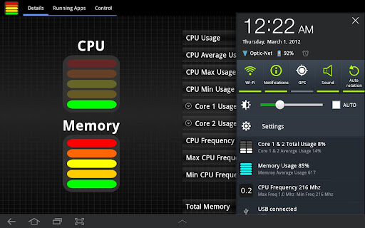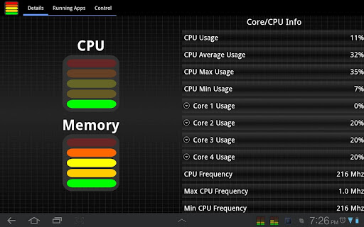 Built for Tablets with support for Quad & Dual CPU Cores! Great for monitoring your CPU Usage, Frequency, & Memory when changing live wallpapers and other apps. Our app has a very small resource footprint to help with battery life. Simple User Interface allows for information on CPU load and app configuration.