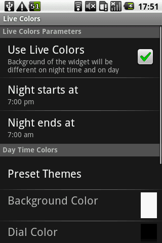 - Live Colors - unterschiedlicher Look des Widgets nachts und tagsüber (in der Pro-Version)