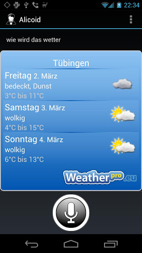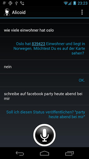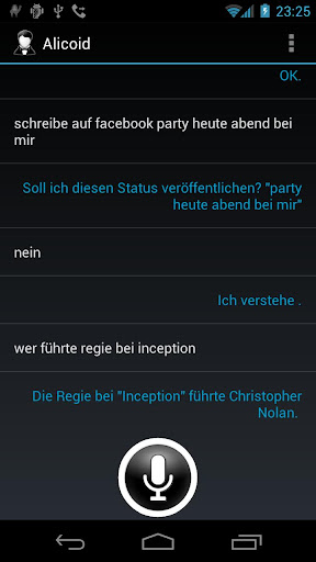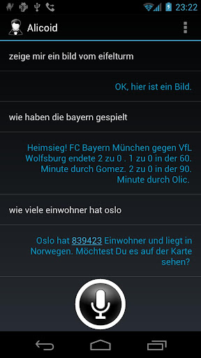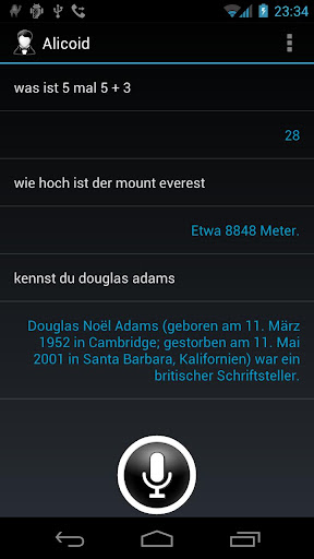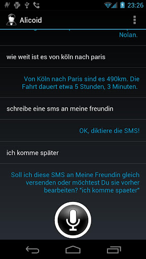 Alicoid - das Original - ist Dein persönlicher Butler und Unterhalter, ähnlich wie Siri auf dem iPhone. Du kannst dich einfach mit Alicoid unterhalten (und das können sehr lustige Gespräche werden!) oder Aufträge erteilen: sage z.B. "Erstelle einen Termin für nächsten Samstag um 15 Uhr Fussball" oder frage Alicoid nach allem, was Dich interessiert, z.B. "Wie weit ist es von Hamburg nach Kiel?".