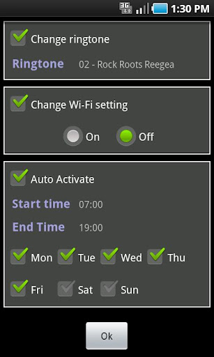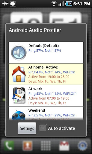 Easy and non-invasive manager to create custom profiles, specifying ringtone, all volumes, WiFi and Bluetooth state, profile icon and auto-switch timetable