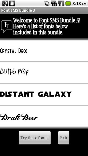 Check out Font SMS Bundle 1, Font SMS Bundle 2, Font SMS Bundle 4 (250 fonts!), Font SMS Bundle 5, and NOW Font SMS Bundle Script (all handwritten-style fonts!) for 385 more fonts to personalize your GO SMS Pro, GO Keyboard, GO Launcher EX, chompSMS, or Handcent SMS application!