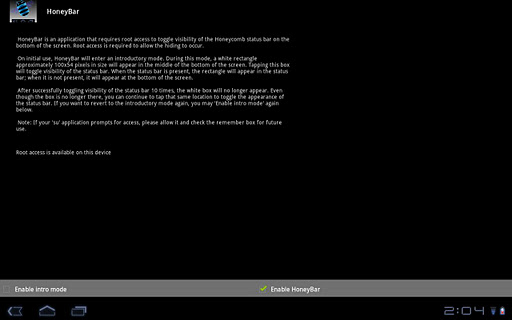 HoneyBar is an application that requires root access to toggle visibility of the Honeycomb status bar on the bottom of the screen. Root access is required to allow the hiding to occur.