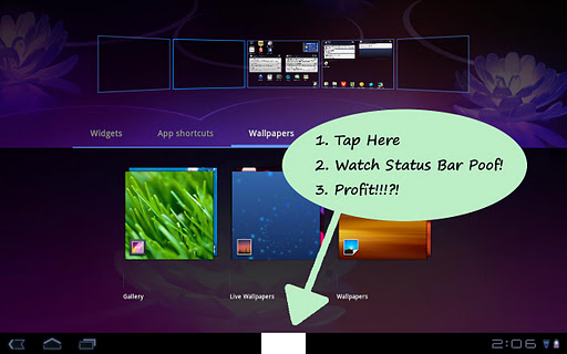*** Important note for ICS users: Honeybar is unsupported on ICS and will not hide the UI bar. I have examined the source for ActivityManagerService and it currently appears impossible to stop com.android.systemui