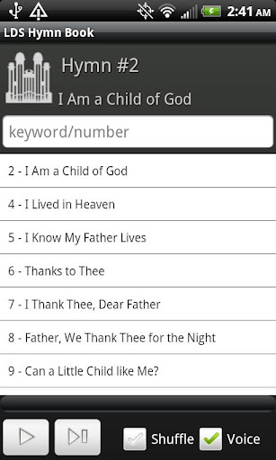 - New Hymn Playlist Player (search and listen to your hymns in either voice mode or music mode in your playlist, access to all hymns in the app. With Seek Bar, Shuffle mode, playback controls.)