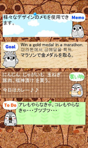 Dies ist ein Notizblock-Widget von "Pesoguin", ein beliebter Charakter in Japan. Bitte tippen Sie auf das Widget, und Sie können Memo schreiben. Bitte verwenden Sie es wie klebrige, post-it, oder Notizblock. Sie finden es ein Werkzeug mit voller Unterhaltung. Es wird sicherlich vorher die Produktivität, wenn sie für Ihre Arbeit verwendet. Diese Anwendung ist ein Widget für den Startbildschirm und Sie können die Personalisierung von es zu genießen. Halten Sie die Home-Bildschirm, bis ein zusätzliches Menü des Widgets angezeigt. Suchen Sie sich "Pesoguine Memo Pad" aus einer Liste von Widgets. ※ Pesoguin ist eine imaginäre Tier ähnlich einem Kaiserpinguin Baby, das sehr niedlich und lebt auf dem Internet, PCs und Mobiltelefonen. Er wird die Seele baumeln lassen. Er hat einen netten Freundin, "Pesoko". Sie erscheinen in einem japanischen Vier-Frame Comics Strip buchen. Pesoguin Clock ist eine der beliebtesten Yahoo! Widgets.