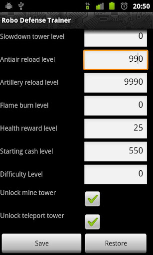 This is the most extensive trainer / cheater for the magnificent Robo Defense game. Both for the old versions and for the new HD version Robo Defense 2.0!