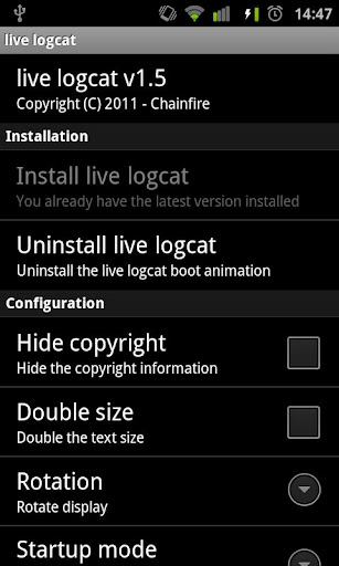 | Name: [root] live logcat Entwickler: Chainfire Preis: Größe: 116k | Version: 2.6 minimale Android Version: 2.1 oder höher Kategorie: Personalisierung Download: Look at the bottom of the page |