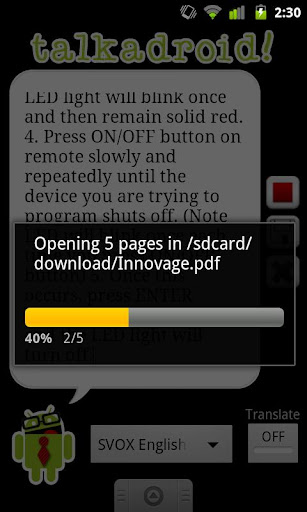 Talkadroid unterstützt derzeit .doc, .txt .docx, .txt, und Microsoft Word. PDF kommt bald.
