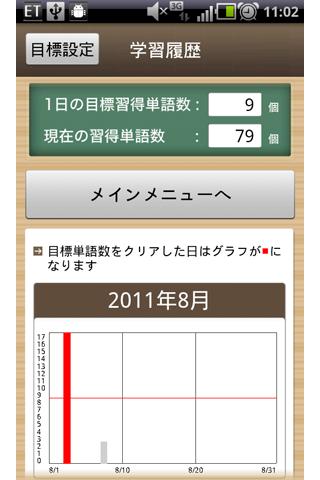 目標設定で「この日までに3000語習得する!」といった目標をアプリに登録しておけば、1日の目標習得単語数や、現在の習得単語数の進捗も確認可能。グラフで目標の進捗を把握でき、やる気もUP!