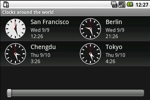 Einfach zu nutzende, hübsche Weltzeituhr. Enthält Zeitzonendaten für ca. 21000 Städte, historische und übersetzte Namen für große Städte. Analoge und digitale Uhrzeitanzeige sowie Datumsangabe. Innovative "Zeitschieber" vereinfachen das Finden von günstigen Anrufzeiten über Zeitzonen hinweg. Neu: Froyo SD Unterstützung.
